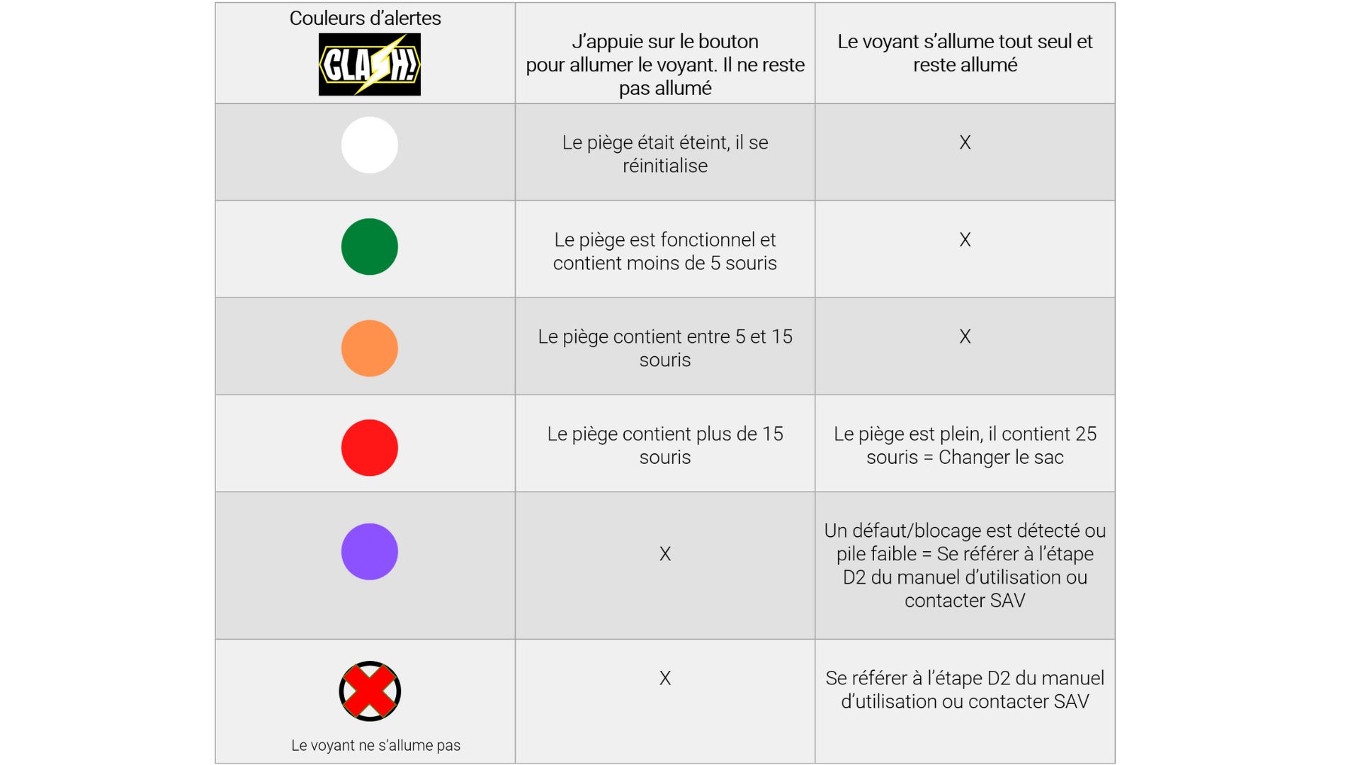 Quand le sac contient 25 souris, le CLASH! s’éteint automatiquement, la LED s’allume en rouge et reste allumée. Vous devez alors changer le sac.